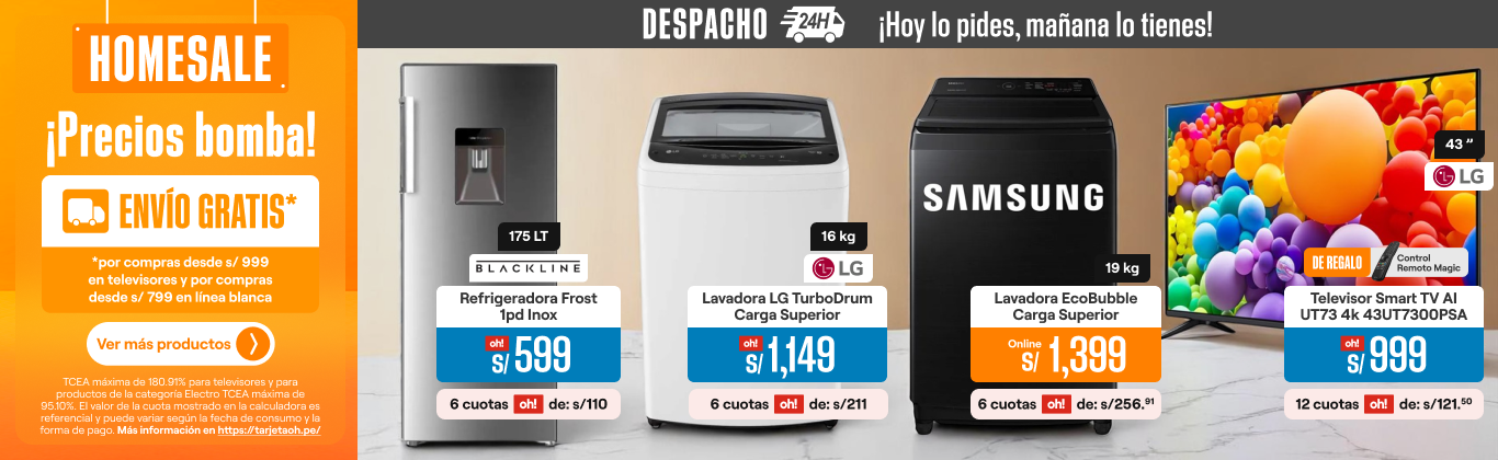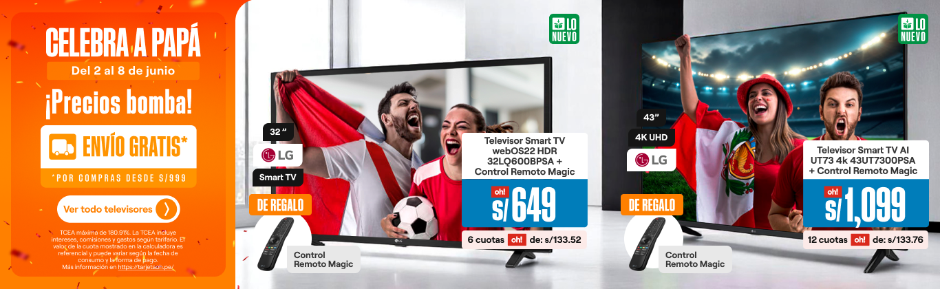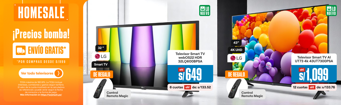 Sin salir de casa, selecciona el televisor ideal para la sala o dormitorio en la resolución: UHD, 4k, OLED o QLED. Tenemos las mejores marcas de televisores Smart TV: Samsung, LG y más. También, están a la venta racks, mesas para TV, Puffs y centros de entretenimiento, para que coloques tu nueva TV en el lugar que desees. Complementa con accesorios y dispositivos para aprovechar su funcionamiento al máximo. Además, no olvides de conocer más sobre Los 3 mejores televisores de este 2025.