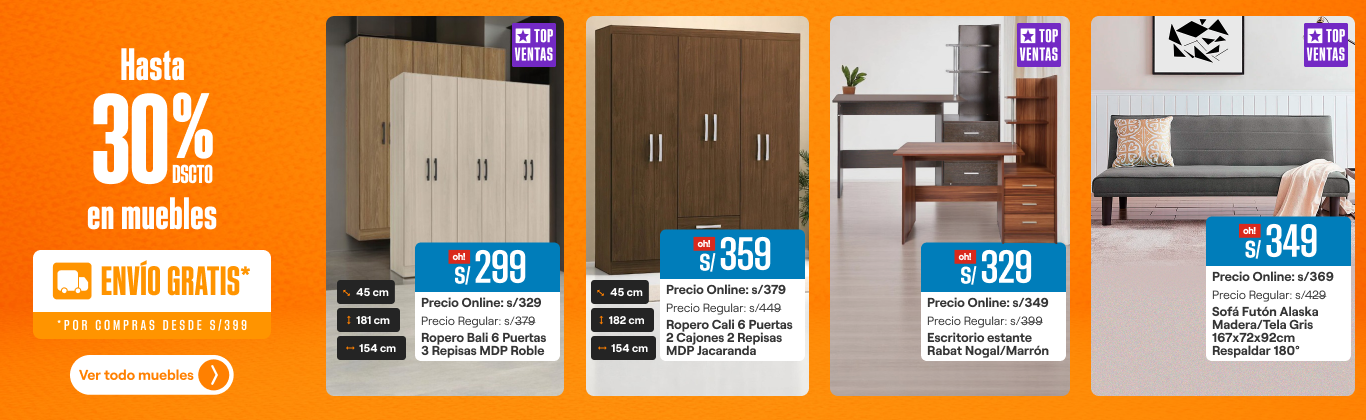 Organiza cada espacio de tu hogar con los muebles de melamina, madera y demás materiales de excelente calidad que tenemos en Promart.pe. Encuentra el mobiliario perfecto para el home office: sillas de oficina, sofá cama y futones, sillas ergonómicas, sillas gamer, escritorios, tanto de melamina y madera mesas de centro y libreros. Igual de importante es el dormitorio, por ello compra la cama y colchón del tamaño que te resulte más cómodo, ya sea de 1, 1,5 plaza o 2 plazas, King o Queen. Así mismo, contamos con las mejores marcas de colchones en Perú: colchones Paraíso, colchones Cisne, Forli, Rosen, Drimer y mucho más. Otra opción es un juego de dormitorio o un camarote si el cuarto es compartido con otra persona. No olvides los roperos que tenemos disponible en varios colores, perfecto para organizar toda la ropa en su interior y ahorrar el mayor espacio posible. Además, contamos con los mejores materiales como los roperos de melamina y roperos de madera para que escojas el que más te guste de acuerdo a tu estilo. Así mismo, para maximizar la organización de tu dormitorio puedes adquirir nuestras zapateras en diversos materiales como: melamina y madera.