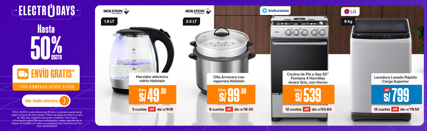 Agiliza la preparación de diversos platillos y alimentos con los electrodomésticos adecuados en la cocina de tu hogar. Además, aquí tenemos las mejores marcas: Samsung, Lg, Oster, Imaco, Philips, KitchenAid y muchas más. ¿Una cocina a gas, eléctrica, o cocina de inducción? La respuesta va depender del área a ocupar, completa tu pedido con una campana extractora u horno. Otros electrodomésticos a considerar son: el microondas para cocinar en pocos minutos o calentar comida, batidora y licuadora para mezclar ingredientes, olla arrocera; cafetera y hervidor eléctrico para bebidas calientes, mientras que un extractor o exprimidor para bebidas frías. En esta lista no puede faltar la favorita de much@s: la freidora de aire, perfecta para freír, tostar u hornear diversos alimentos sin aceite. Asimismo, descubre los mejores modelos de balanzas que tenemos para ti.