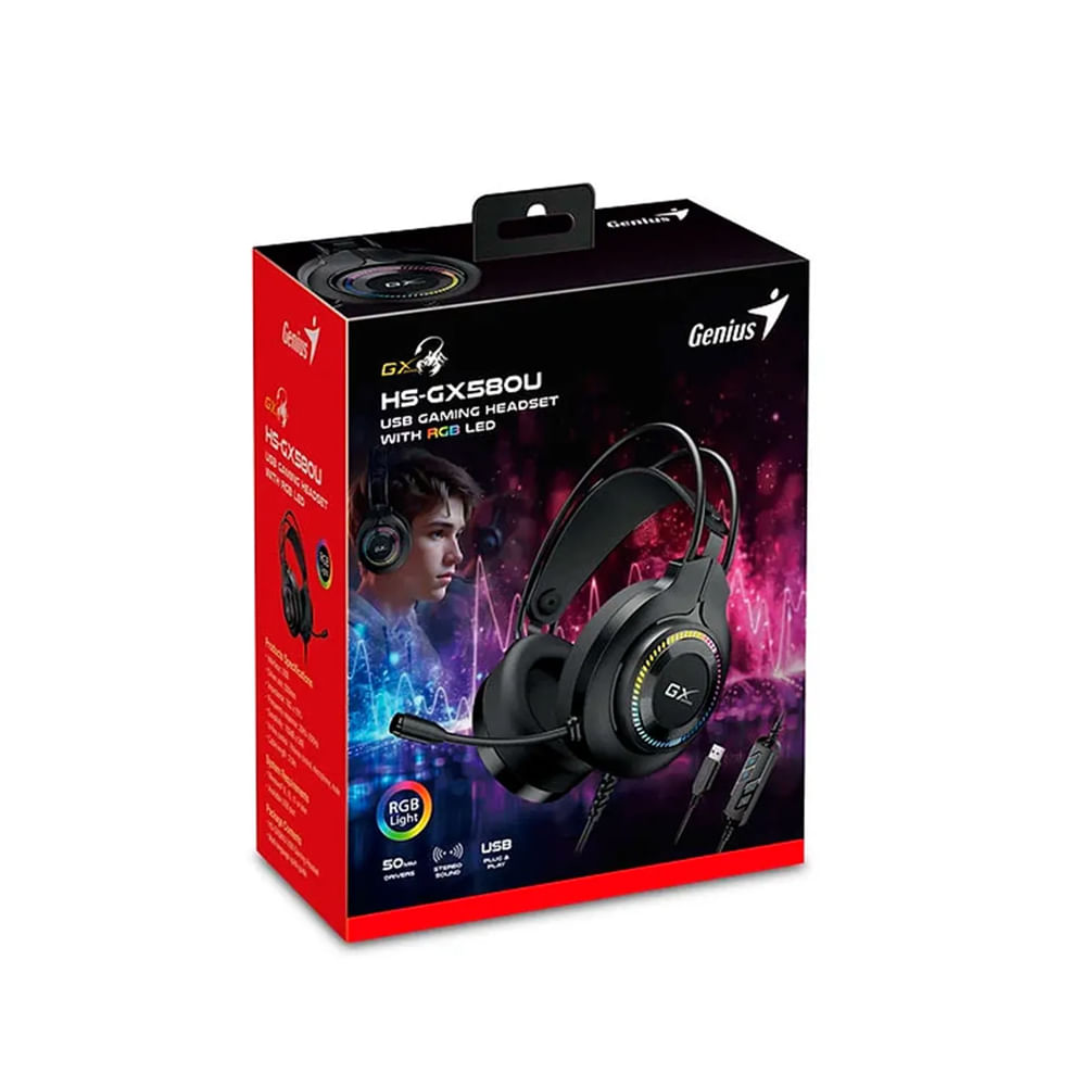 Auriculares Genius GX-HS580U con micrófono, 50mm, iluminación RGB, color negro, sonido envolvente
