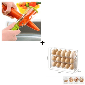 Combo Pelador de Frutas y Verduras con Contenedor + Porta Huevo Acrílico 3 Niveles