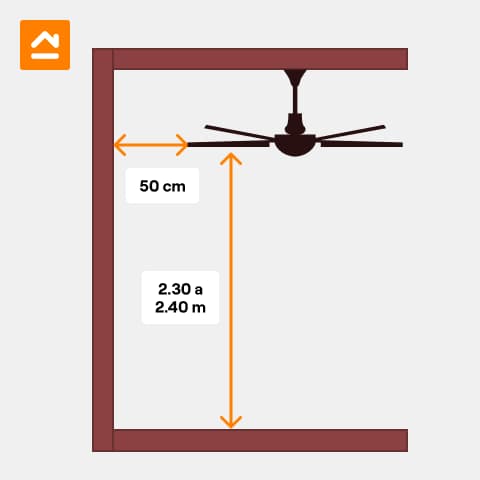 • Un ventilador de techo debe colgar a un distancia de entre 2.3 y 2.4 m del suelo a las aspas para estar lo bastante alto como para no estorbar y lo bastante bajo como para refrescar el cuarto.