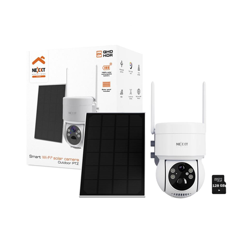 Cámara Wifi PTZ Nexxt NHC-OP20S 3MP 2K Panel Solar Sirena Reflector IP65 + SD 128GB