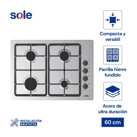 Cocina Encimera a Gas Sole Compacta 4 Hornillas Acero Inoxidable Gris
