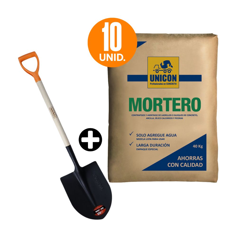 COMBO 10 Mortero de Arena Gruesa y Cemento Unicon 40 kg + Lampa Construcción con Mango de Plástico 1.1kg Werken