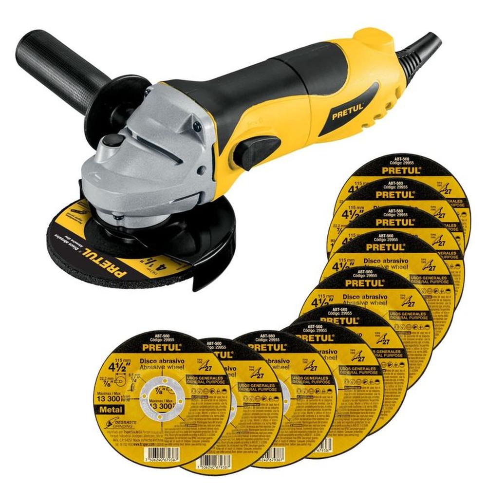 COMBO Amoladora Esmeriladora 4 1/2", 700 W, 10 discos de desbaste AMARILLO Y NEGRO