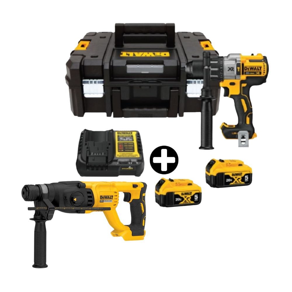 COMBO Dewalt: Taladro Percutor DCD996P2T-B2 20v-3v Brushless + Rotomartillo SDS Plus 20V Modelo DCH133B Amarillo + 2 Bateria 5Ah + Maleta Tstack