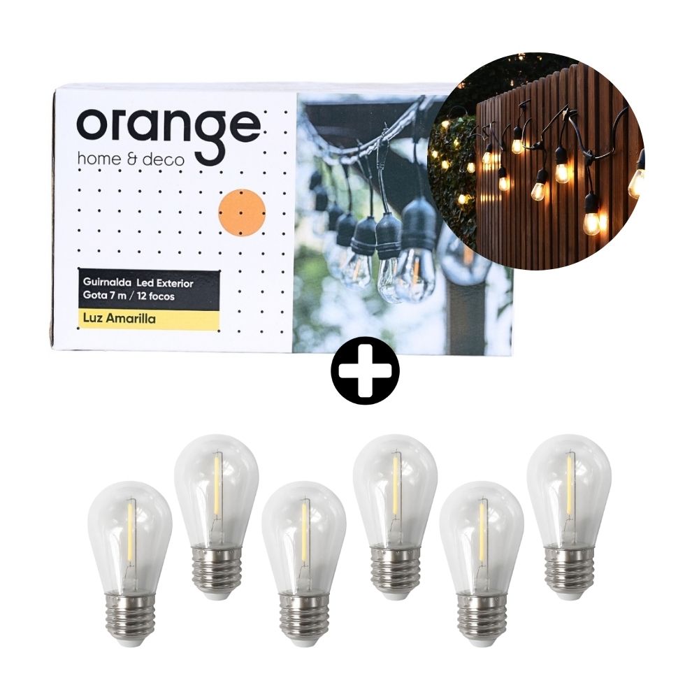 COMBO Guirnalda LED Gota 12 Focos Luz Cálida 7m para Exterior + Foco Vintage S14 E27 1W Luz Cálida Clear x 6 unidades Orange
