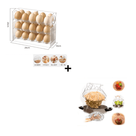 Combo Porta Huevo Acrílico 3 Niveles + Cesta Plegable de Acero