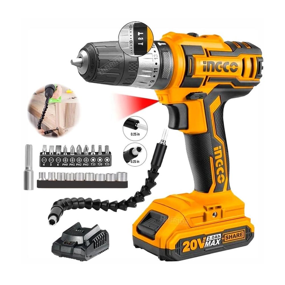 Combo Taladro Percutor 20V Inalámbrico + Adaptador Puntas Dados Ingco