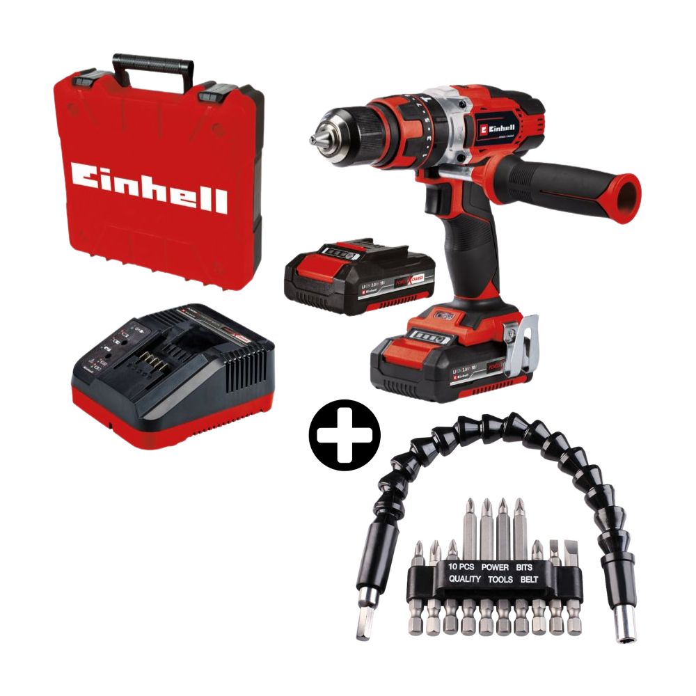 COMBO Taladro Percutor Inalámbrico Einhell TE-CD 18/48 Li-i + 2 Bateria 2 Ah + Set puntas con eje flexible 11 piezas KWB
