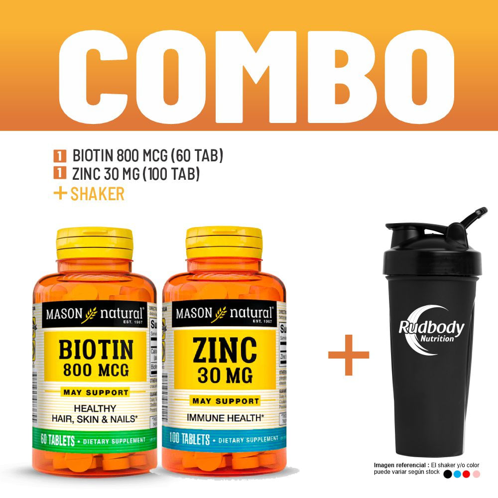 Combo Vitaminas Mason Natural - Biotin 800 Mcg (60 Tab) + Zinc 30 Mg (100 Tab) + Shaker