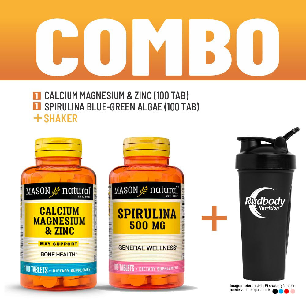 Combo Vitaminas Mason Natural - Calcium Magnesium & Zinc (100 Tab) + Spirulina Blue-Green + Shaker