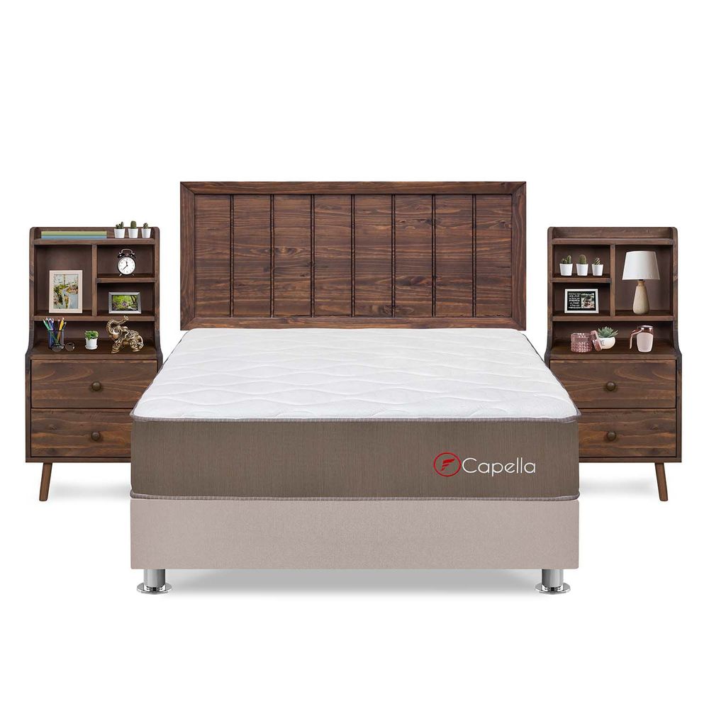 Dormitorio Capella Queen Beige + Velador Fashion + Cabecera Catania Nogal