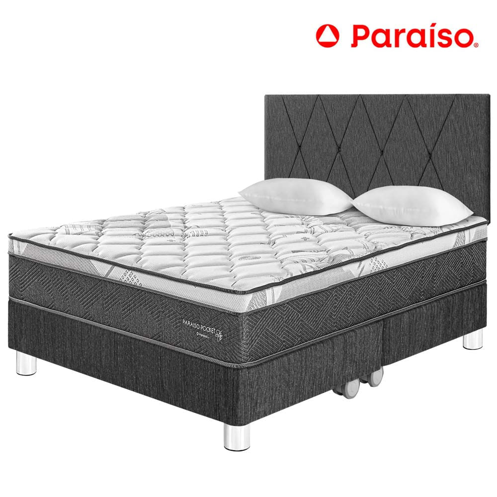 Dormitorio PARAISO Pocket Star Queen + Cabecera Loft Charcoal + 2 Almohadas + 1 Protector