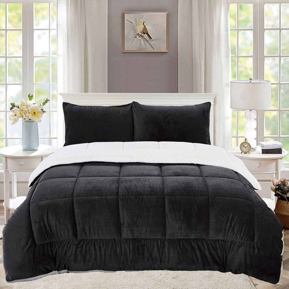 Edredón Queen Piel de Ángel con Sherpa Premium + Juego de Sábanas Negro