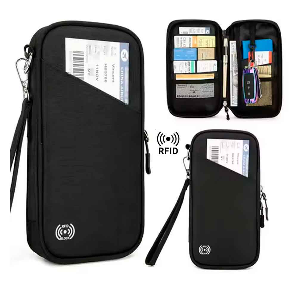 Estuche Organizador Documentos de Viaje RFID con Sujetador Impermeable Negro RD