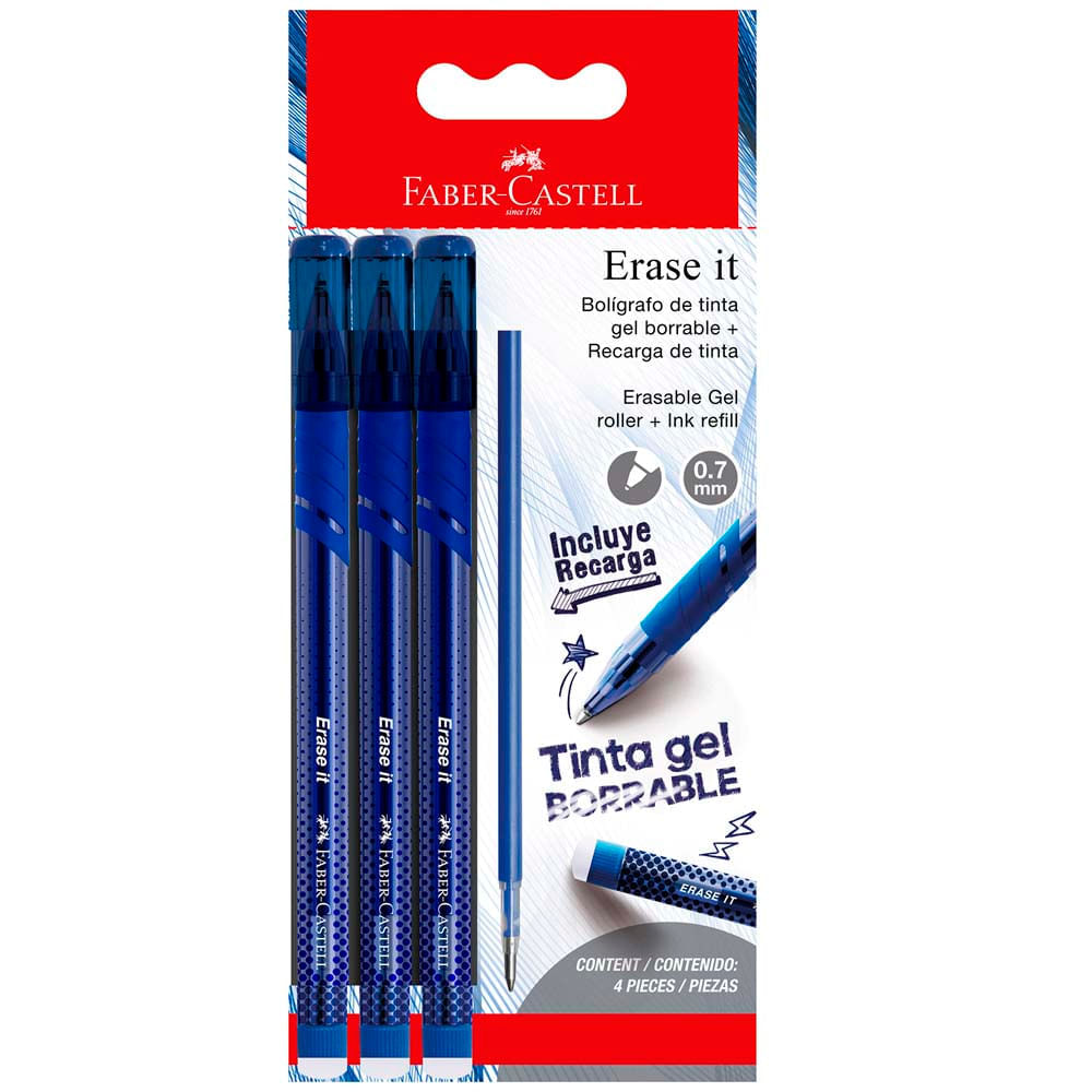 Lapiceros FABER CASTELL Erase It 3-Azul + Refill 3un
