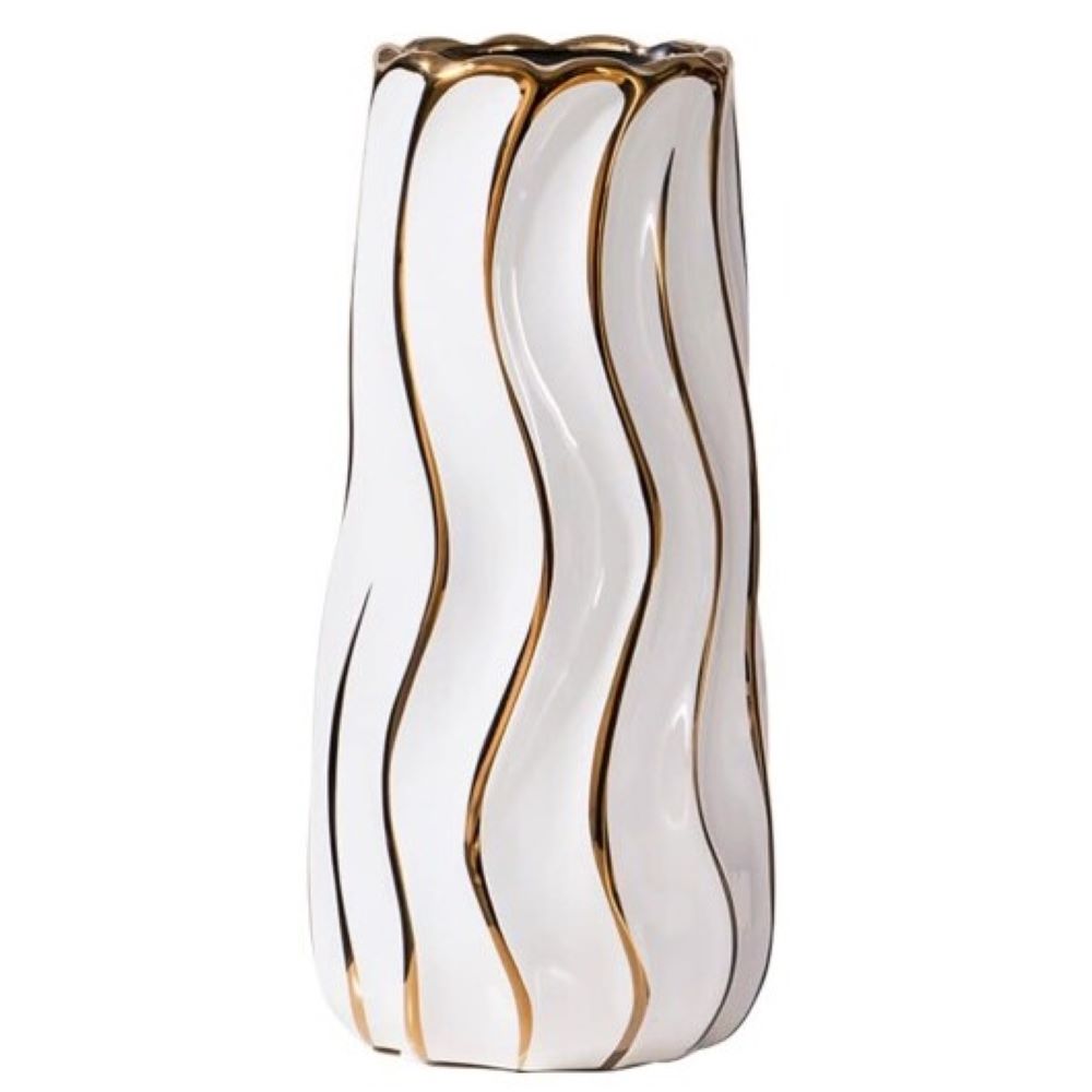 Florero de Céramica Blanco con Rayas y bordes Dorados