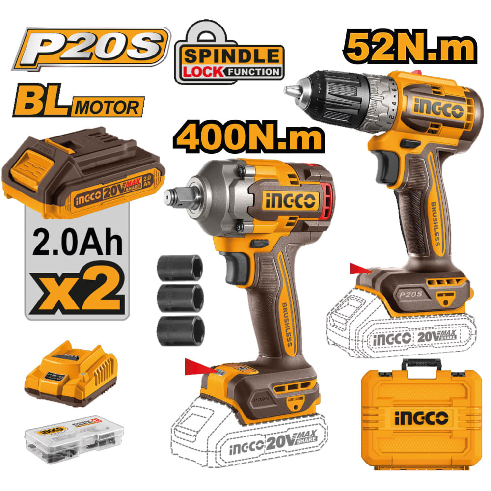 Kit Brushless Llave de Impacto Ingco 20V con Taladro Atornillador 20V 2 Baterías 2.0AH CKLI20271