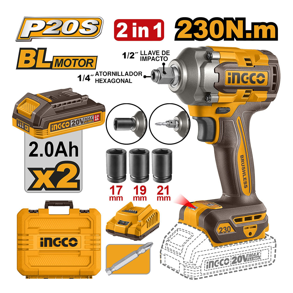 Llave y Atornillador de Impacto Ingco 20V 230NM 2 Baterías 2.0AH Cargador CIWLI20236