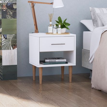 Mesa de Noche Altea con 1 Cajon y Patas de Madera Movenda Blanco