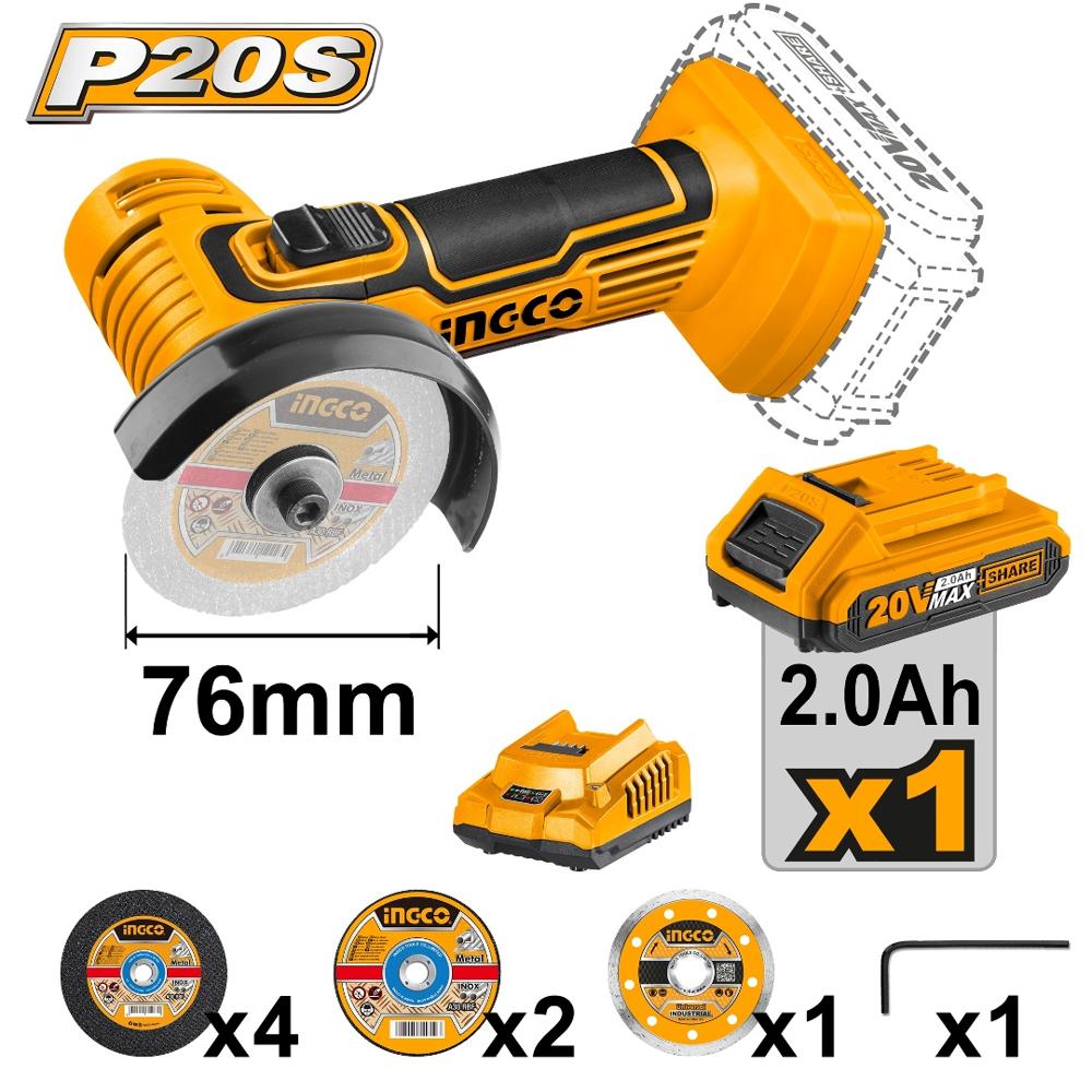Mini Amoladora 3" (76mm) 20V + Batería + Cargador INGCO CAGLI76017