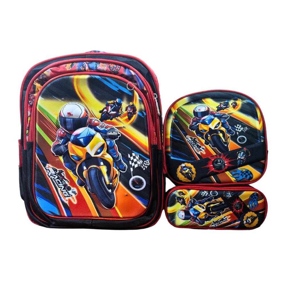 Mochila con Luces Lonchera y Cartuchera para Niños Modelo Motocicleta