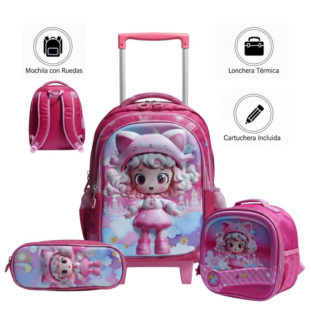 MOCHILA ESCOLAR CON RUEDAS 3 EN 1 - DISEÑO ANIME GATO EN RELIEVE 3D CON LUCES