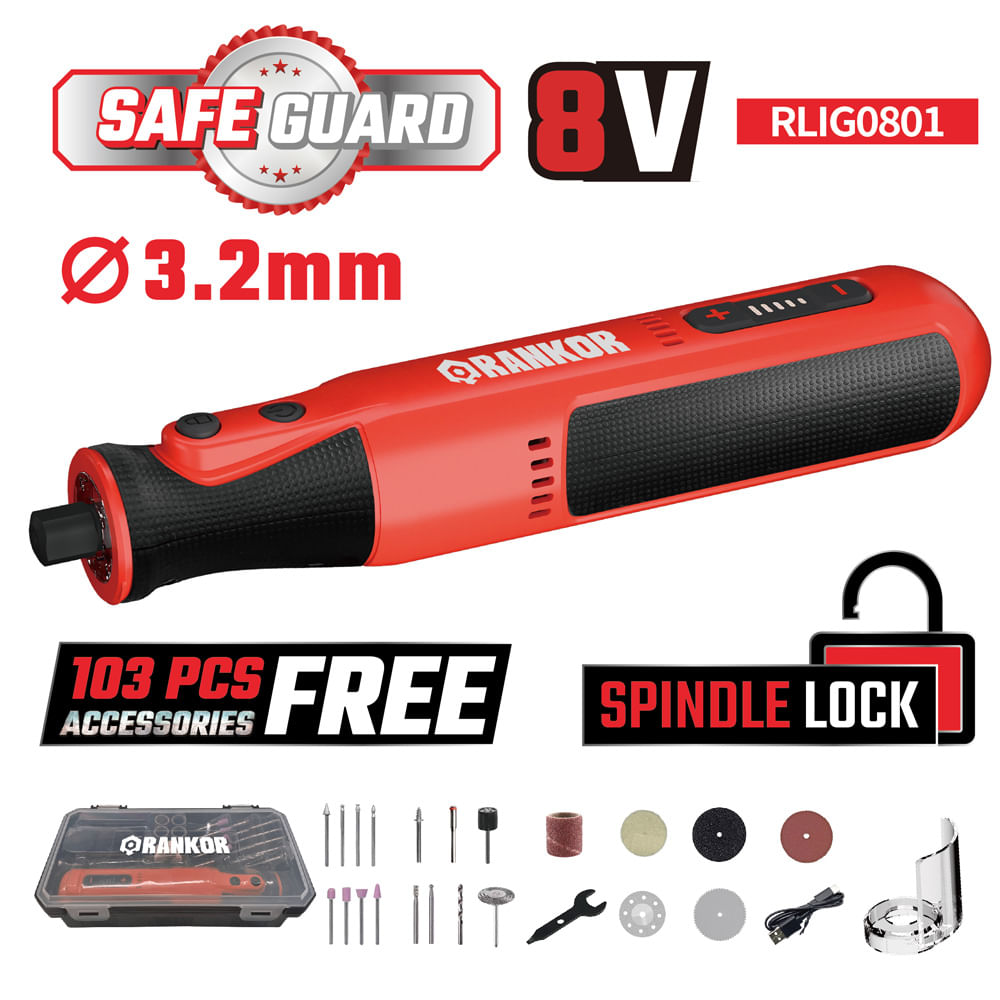 Multiherramienta Minitorno Rankor RLIG0801 8V Veloc. Variable y 103 Piezas