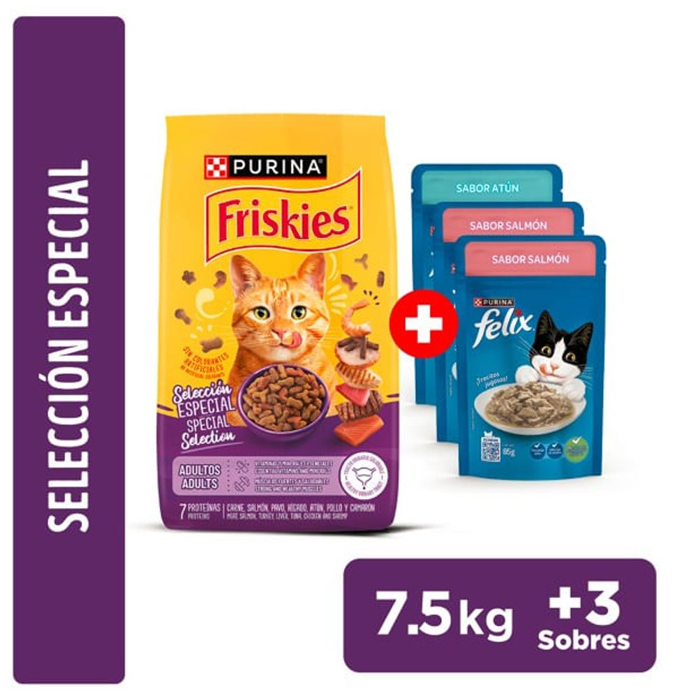 Pack FRISKIES Adultos sabor Salmón 7.5Kg + FELIX Classic con Atún 85g + Classic con Salmón 85g x2un