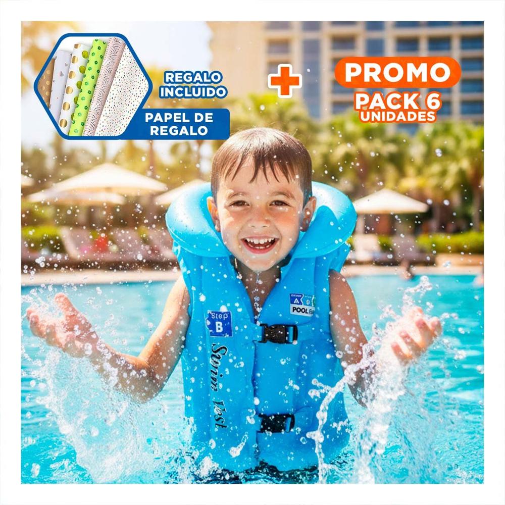 Pack6 Protector Infantil Acuatico MG-4001A Celeste Chaleco Seguro Y+Papel Regalo
