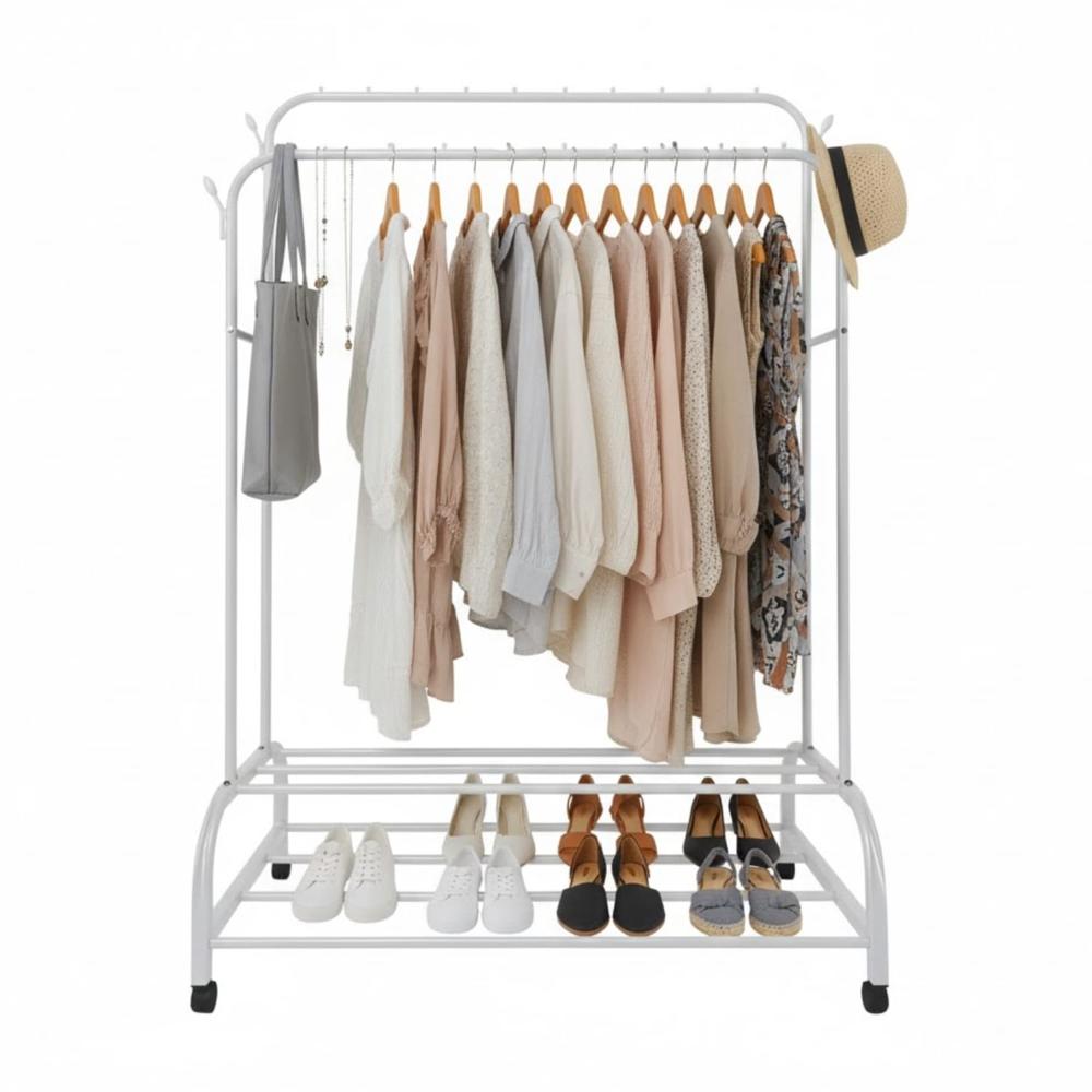 Perchero Doble Colgador Armable con Ruedas y Estantes Blanco