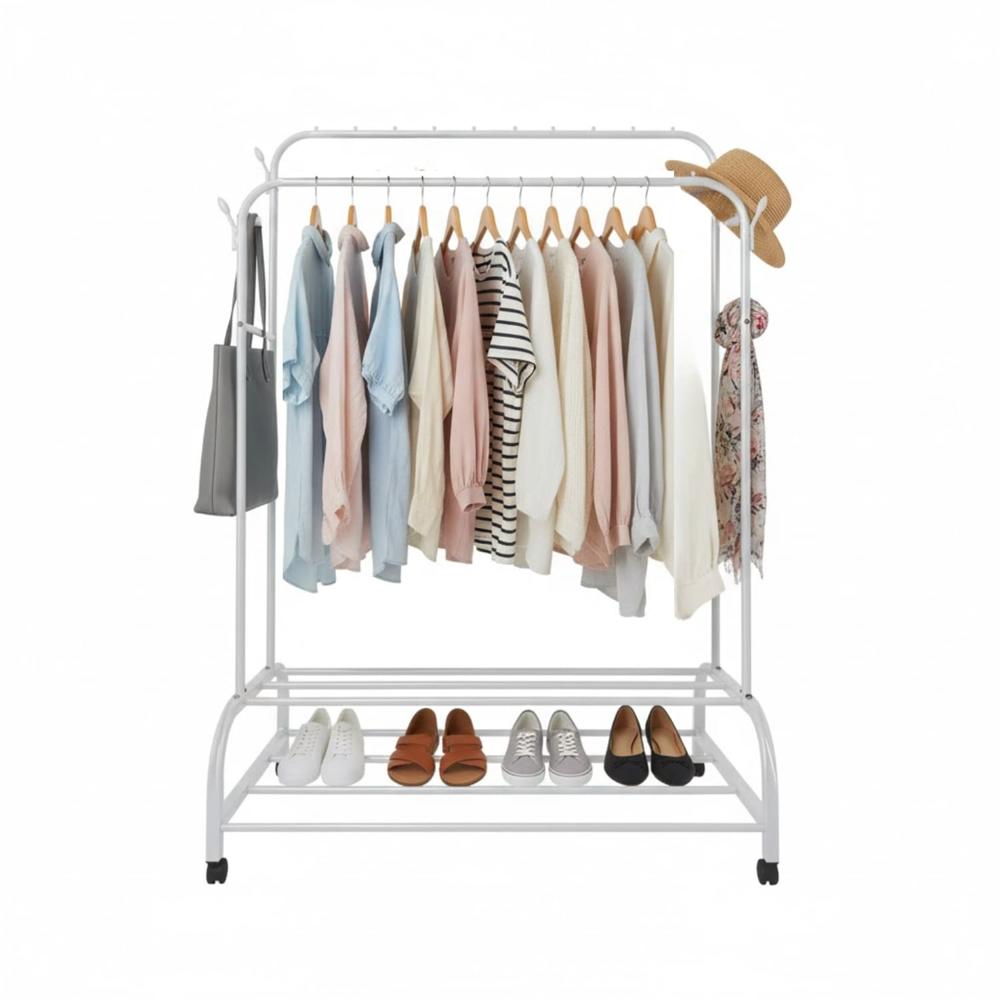 Perchero Organizador Doble Metálico con Ruedas y Estantes Blanco