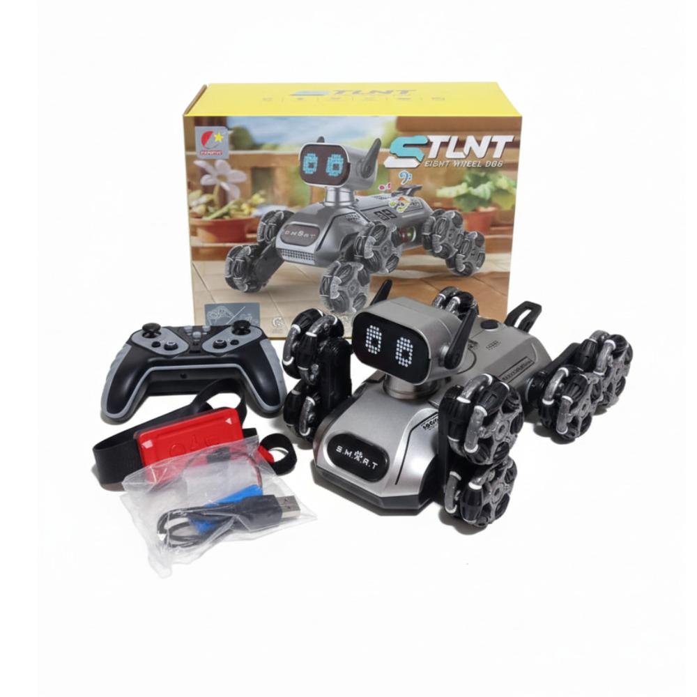 PERRO ROBOT ACROBÁTICO GRIS DE 8 LLANTAS JUGUETE INTERACTIVO Y DIVERTIDO