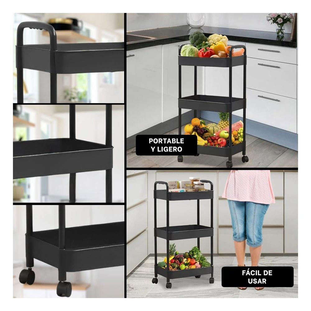 Soporte Movil 3 Niveles con Ruedas y Asas para Organizacion del Hogar Negro