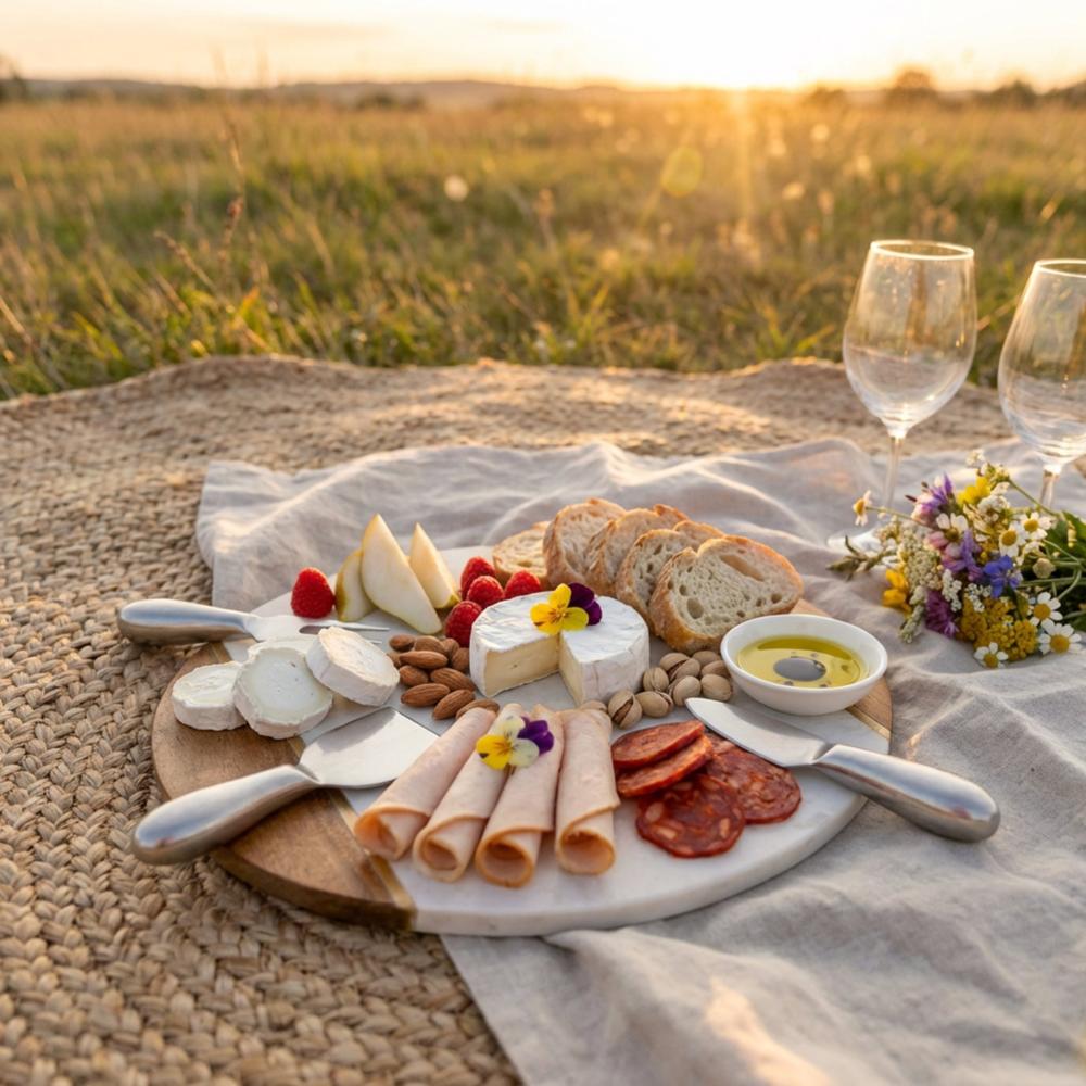 Tabla Premium de Quesos y Charcutería de Mármol y Acacia con Set de Cuchillos