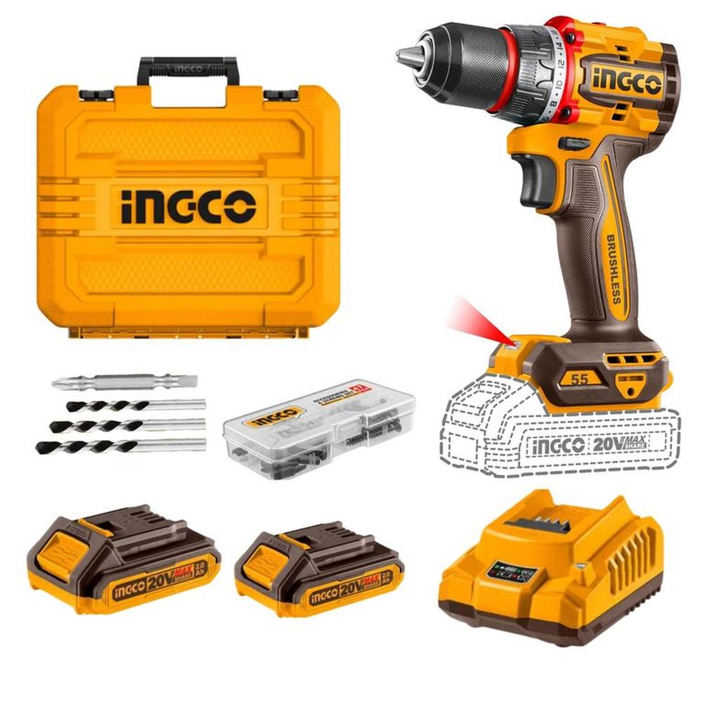 TALADRO PERCUTOR BRUSHLESS 55Nm 20V 2BATERIAS MALETA SET DE BROCAS Amarillo