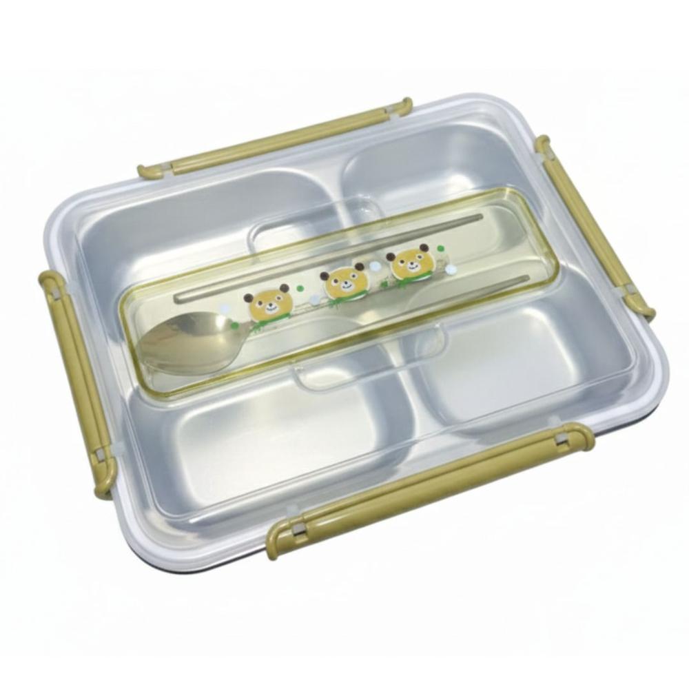Táper con 4 Divisiones Compartimientos Cubiertos Cuchara y Palillos Lonchera Personal Verde