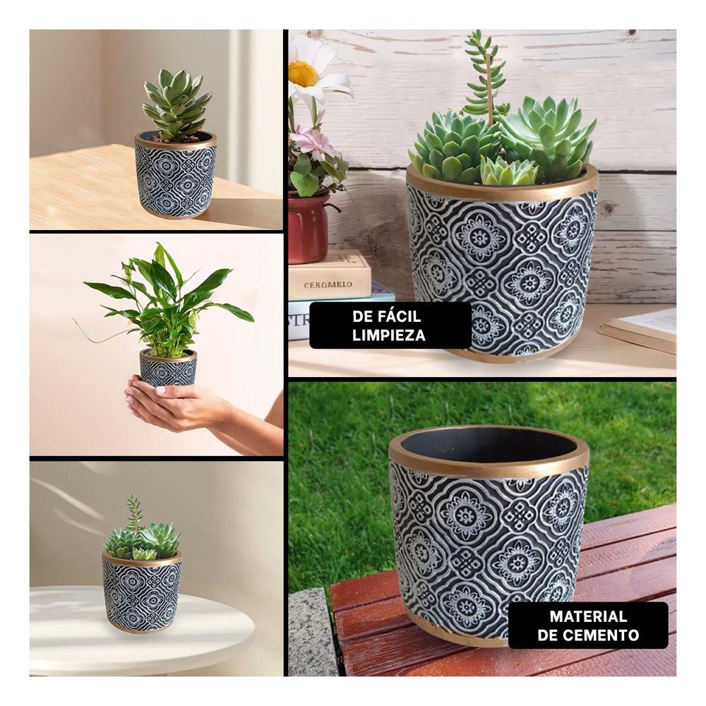 Vasija Moderna Cemento 11x10.5cm Negro Blanco y Dorado Mandala